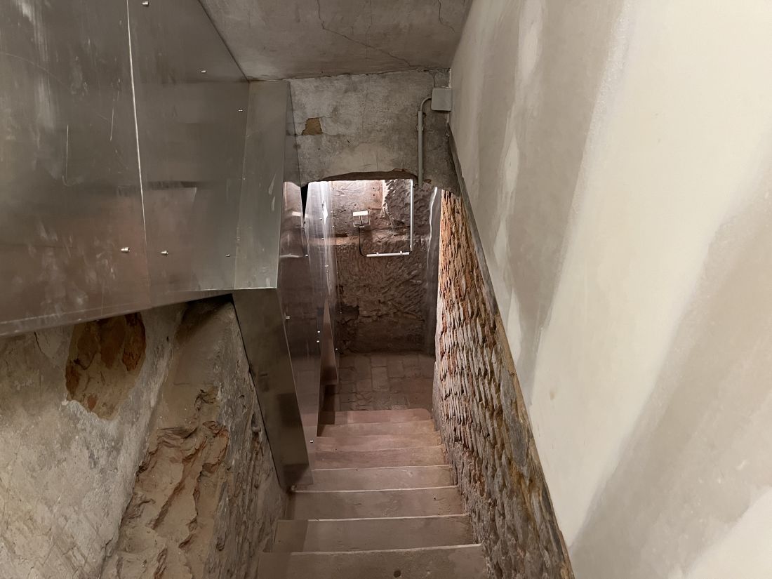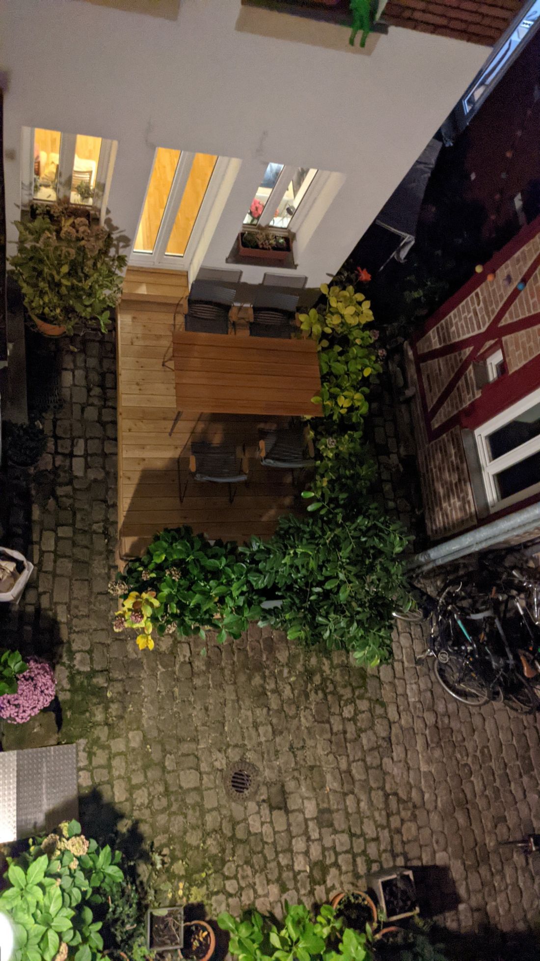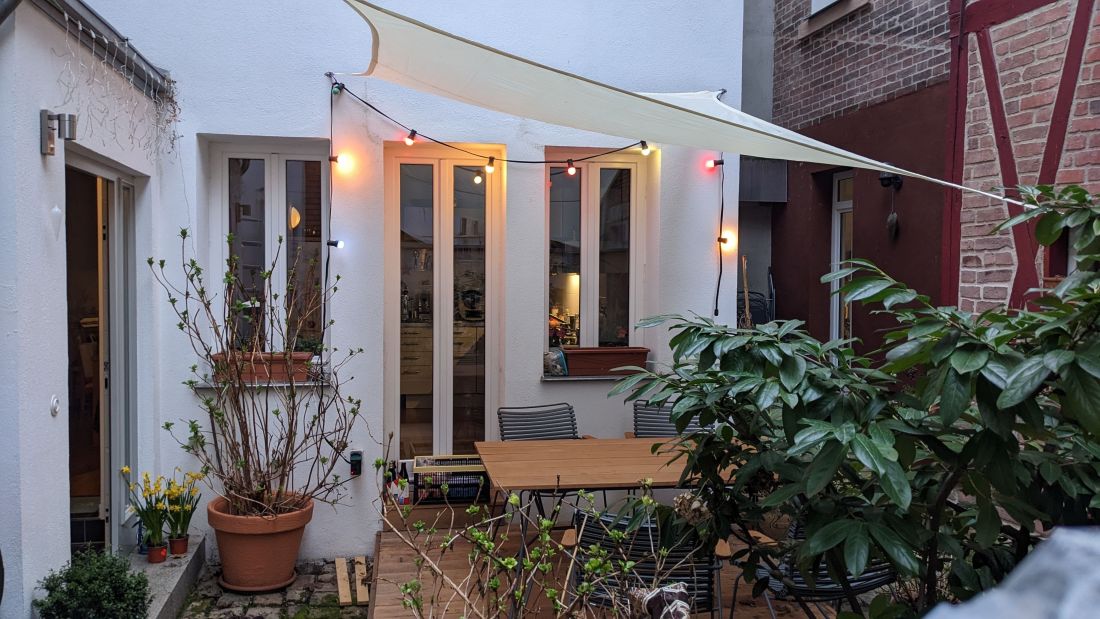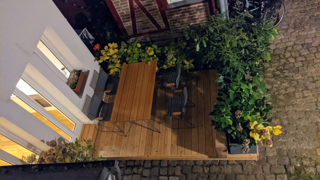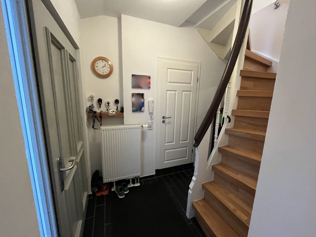 Das Erdgeschoss ist aufgeteilt in eine kleine Diele, ein WC und eine Wohnküche mit Zugang zur im Innenhof des Anwesens gelegenen Terrasse.