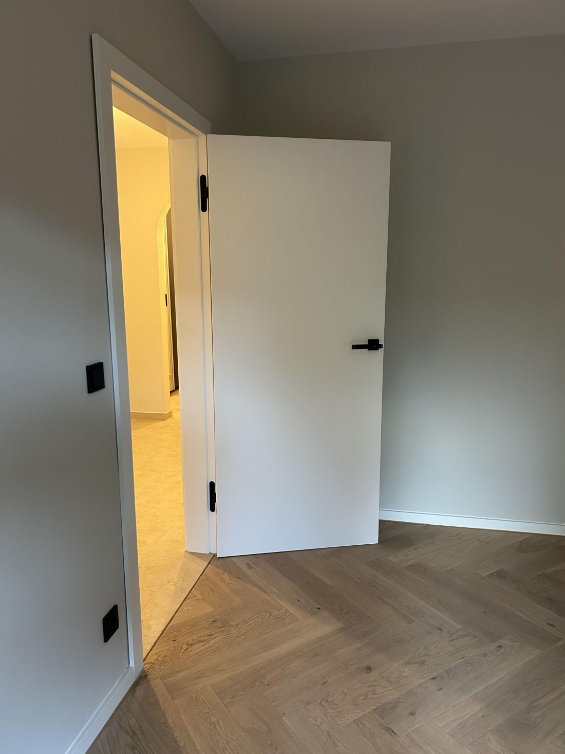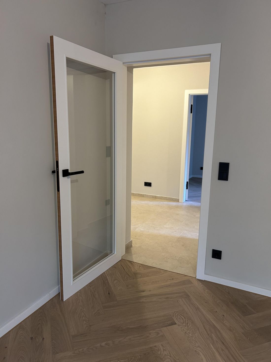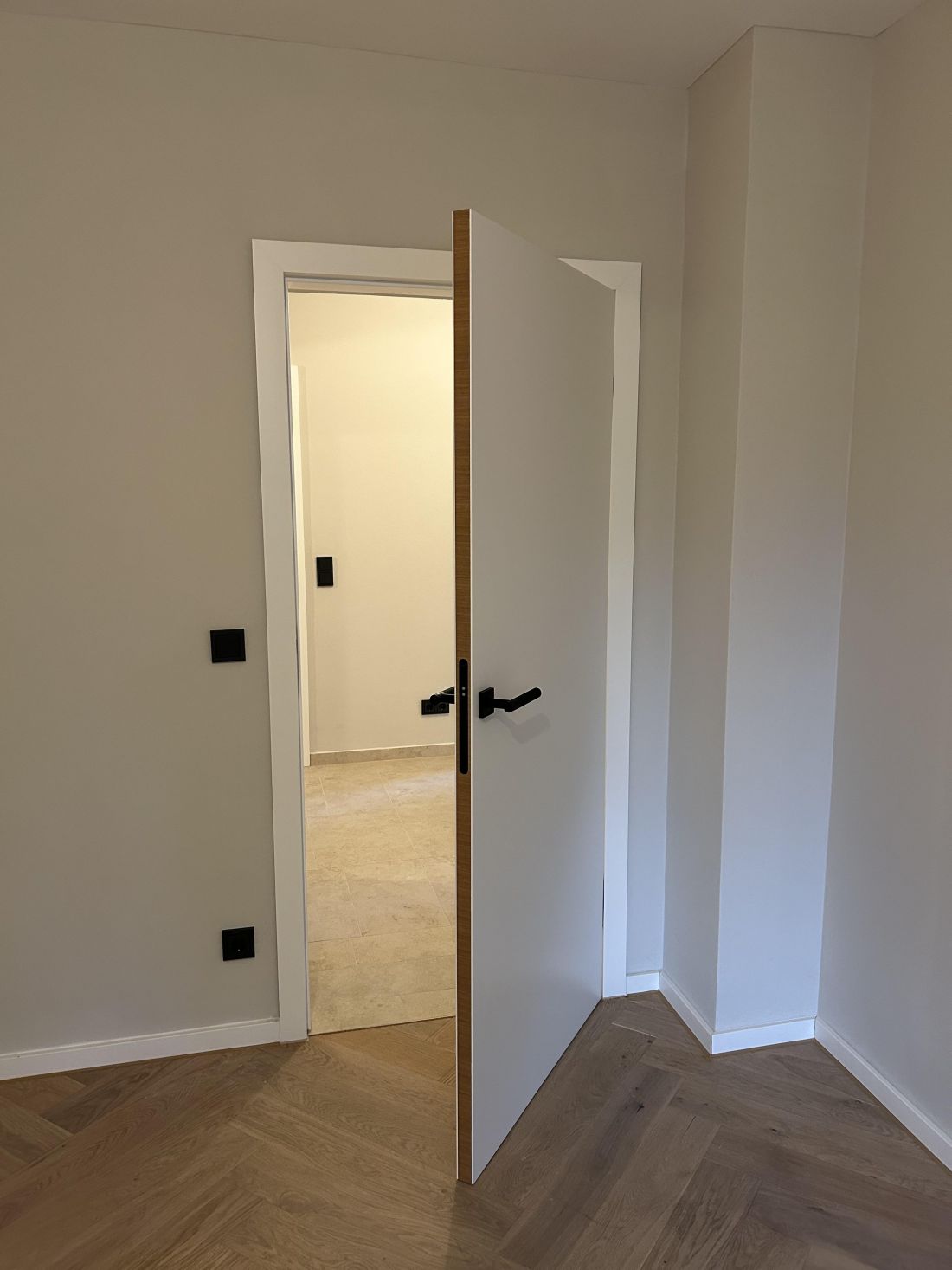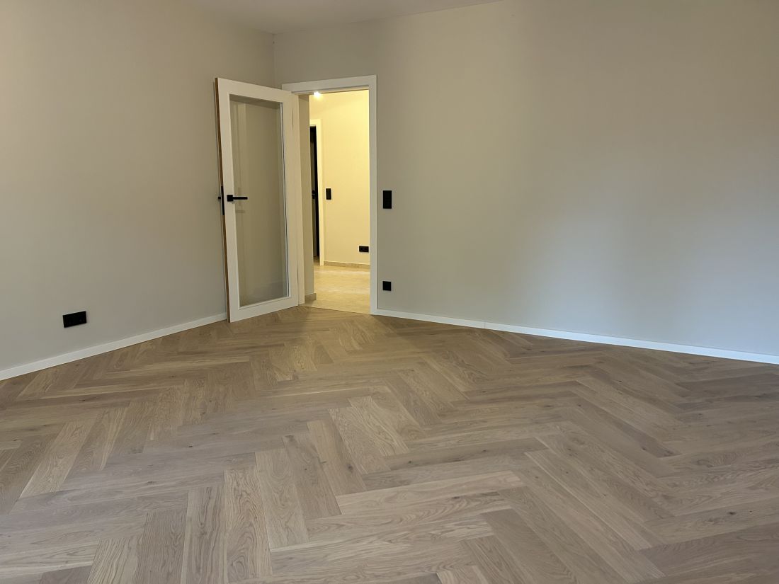 - weiße Designzimmertüren, stumpf einschlagend mit innenliegenden Türbändern und Türkante furniert in Eiche passend zum Boden (Fischgrätparkett Eiche); sehr hochwertige Drückergarnituren