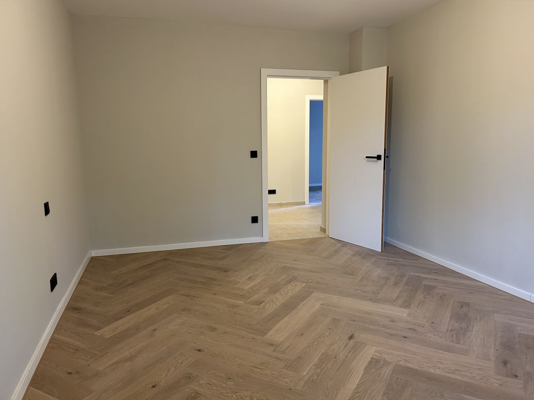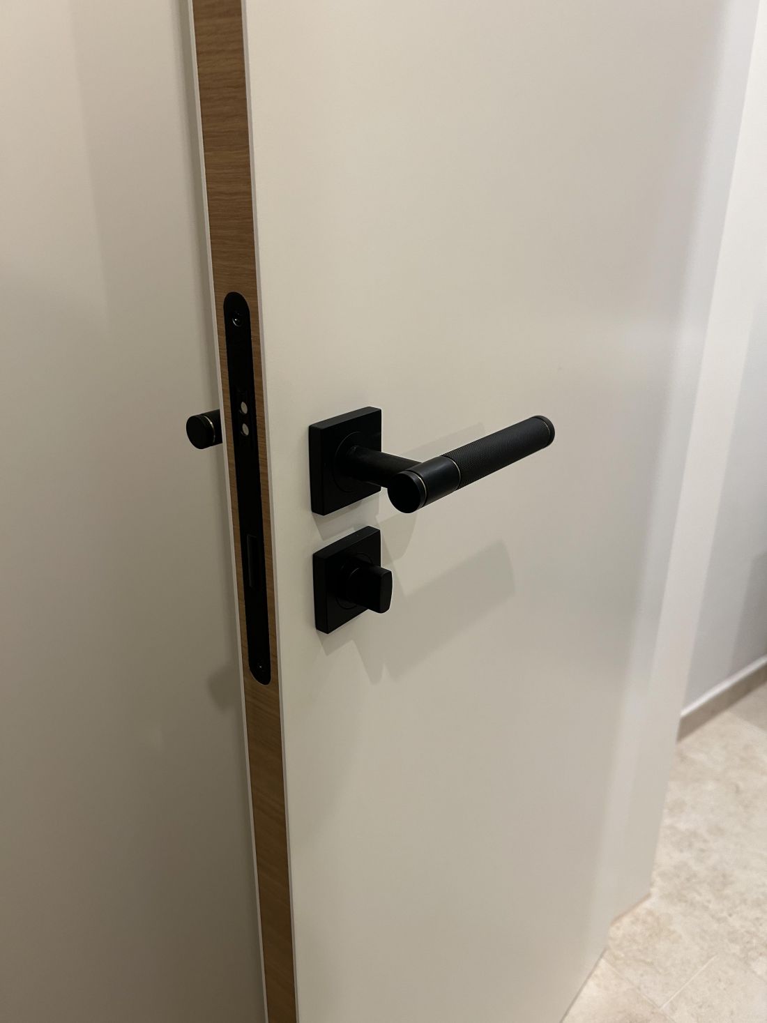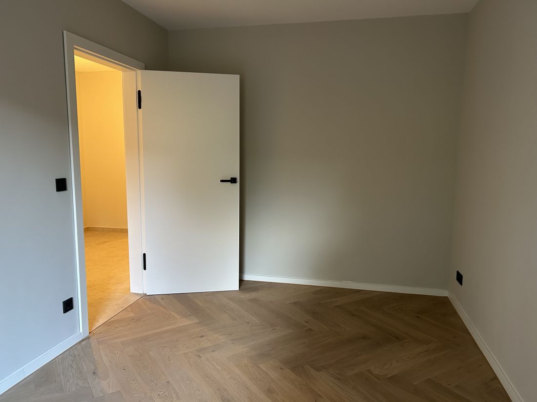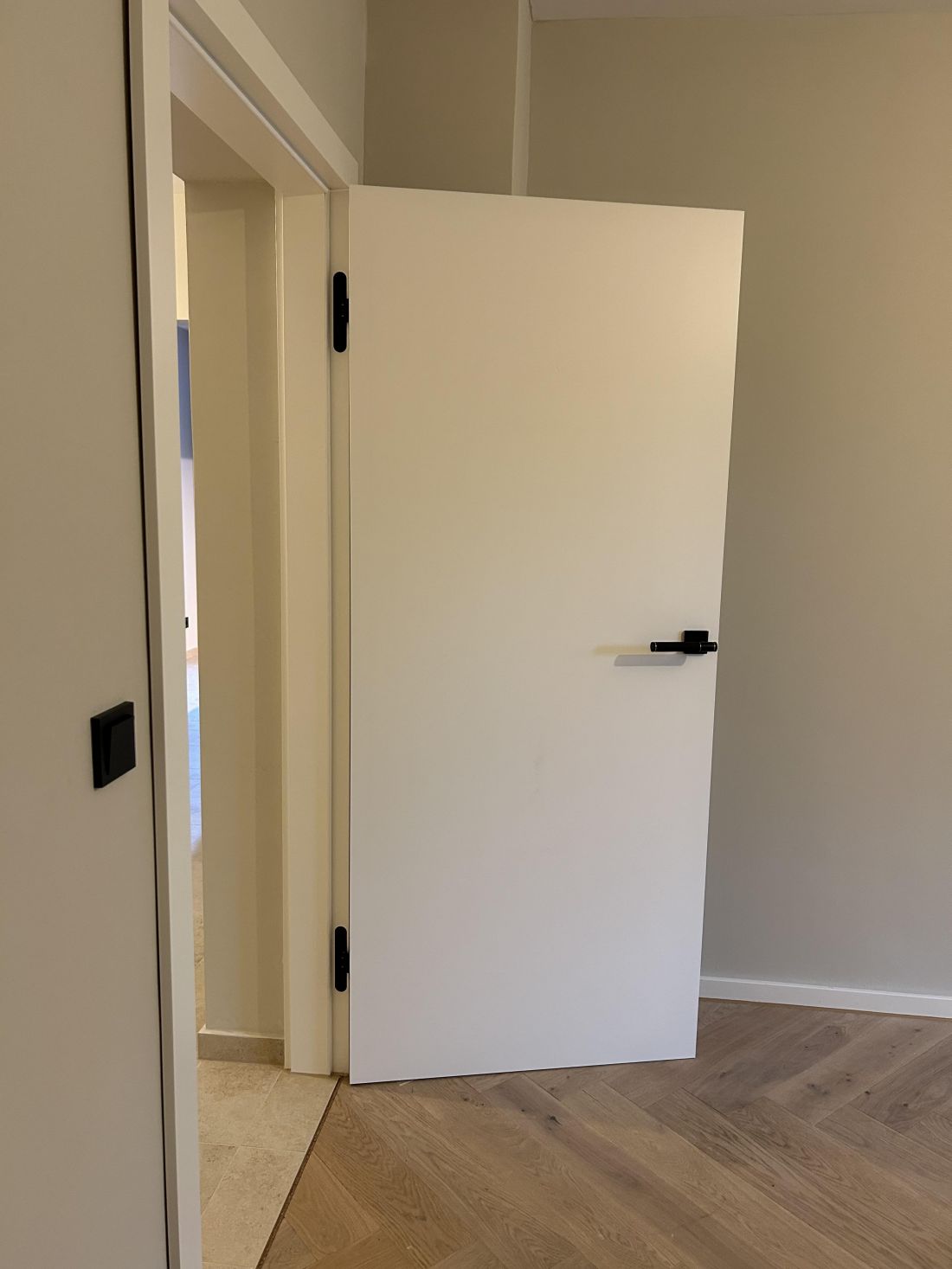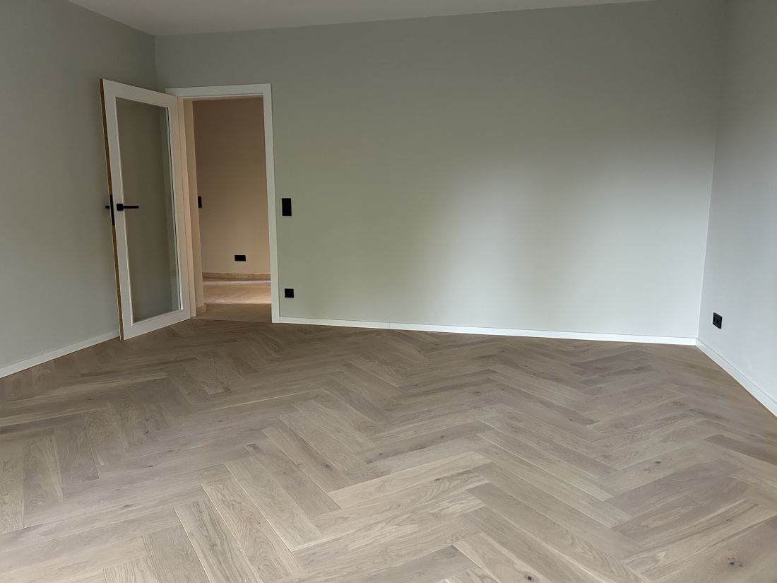 - weiße Designzimmertüren, stumpf einschlagend mit innenliegenden Türbändern und Türkante furniert in Eiche passend zum Boden (Fischgrätparkett Eiche); sehr hochwertige Drückergarnituren
