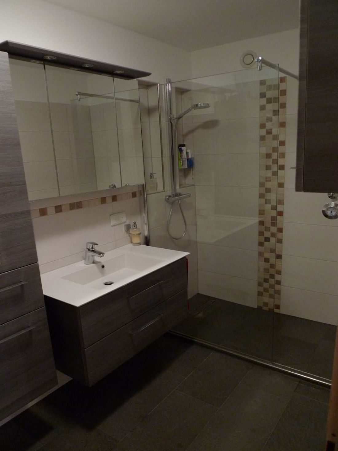 - Bad mit Waschmaschinenanschluss, Badschrank mit Spiegel und bodentiefer Dusche mit Glasabtrennung